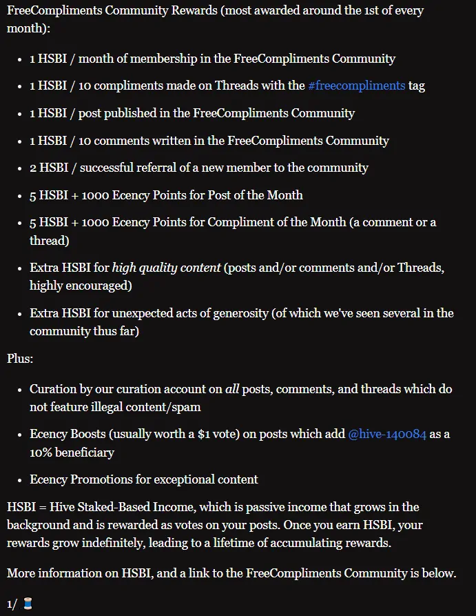 @freecompliments: With HSBI, I particularly like the fact that you're able to reward users with an incentive to post more in the future without penalizing them for not necessarily posting on a daily basis. When someone writes up a quality post or comment, showing a lot of effort, uniqueness, or creativity, I will gladly give them HSBI - and the higher quality the content (whether or not it suits my own worldview), the more HSBI I'll give out. This keeps people coming back because they can see actual rewards for their efforts, and mentioning the rewards as part of a comment adds to a key element on Hive that sometimes goes missing: the direct person-to-person interaction. When I reward HSBI, I make sure to include this aspect.